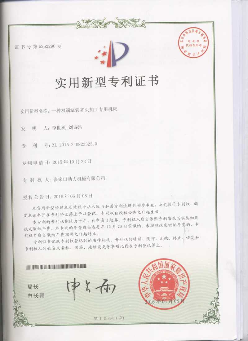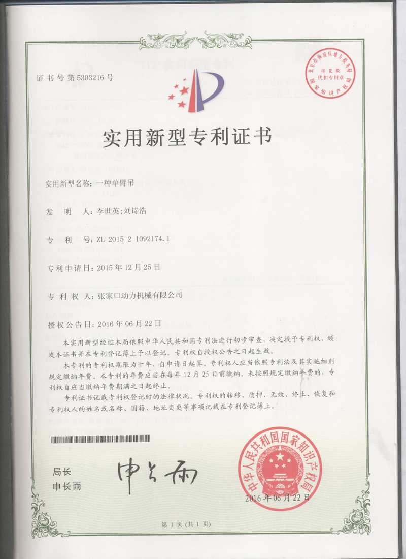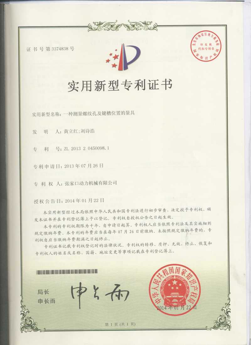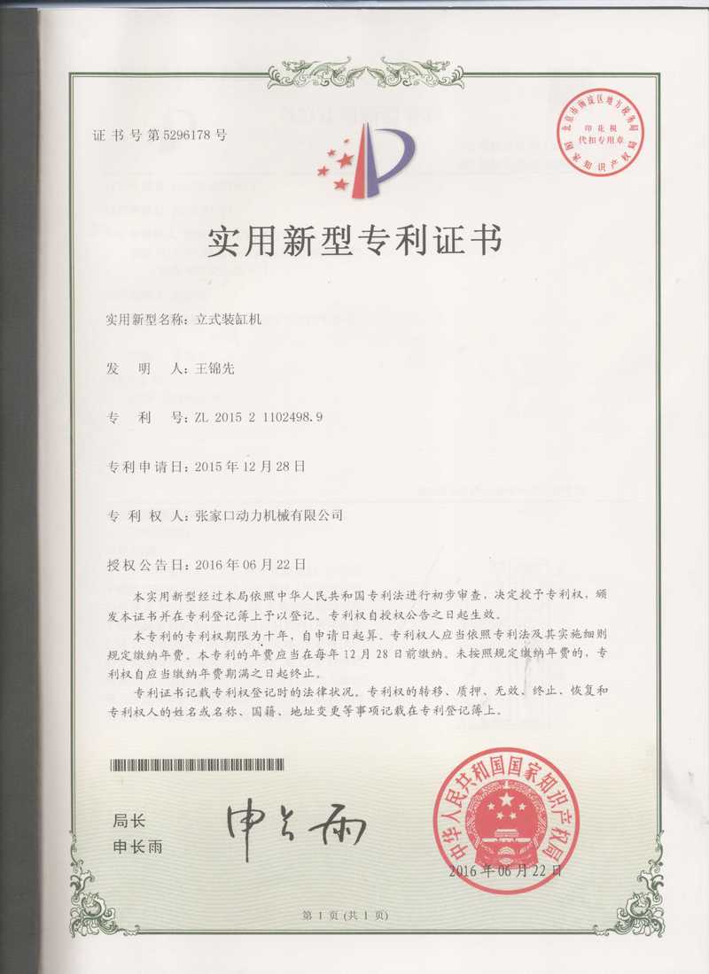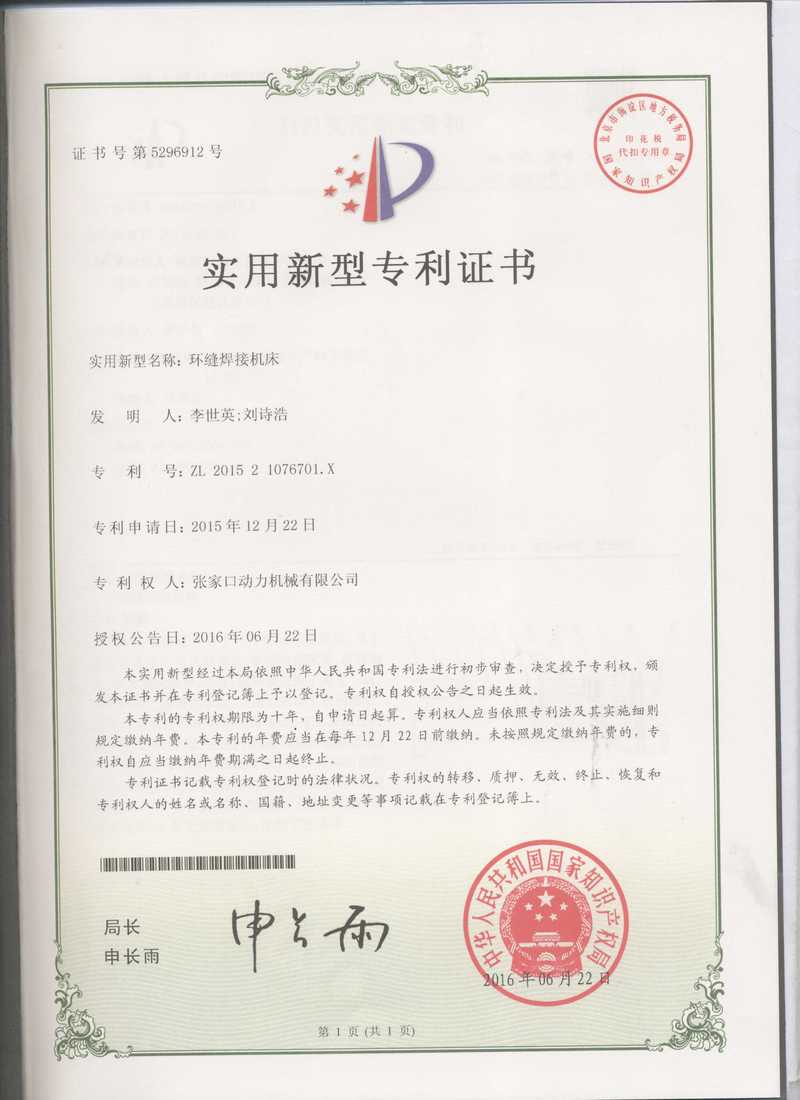 張家口動務(wù)機械有限公司專利證書展示